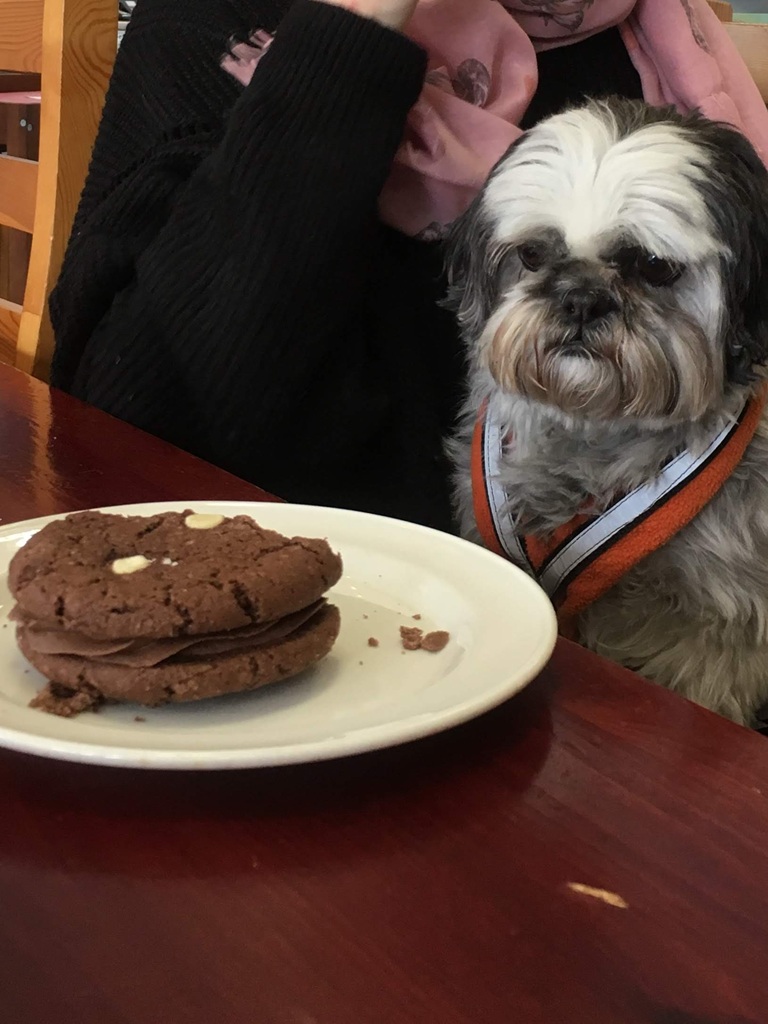 She was very scared of fireworks, something she only got better with in her teenage years, resulting in pack holidays in November each year as they sought out quiet isolated corners of the country to keep her calm, while bonfire night turned population centres into war zones for her. There is always the chance that she just enjoyed holidays and the chance to scrounge for cake in dog-friendly eateries, this photo shows that we shared a trait