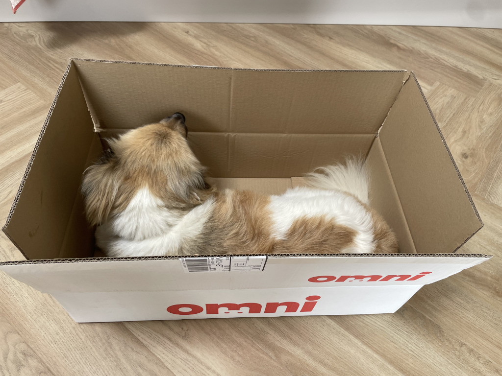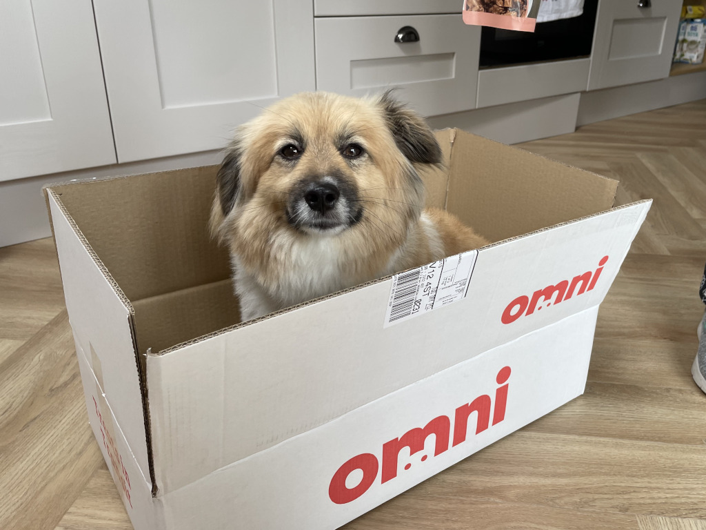 Conveniently this also means that it comes in a box, which smells of food, yummmmmmm. An added bonus being that it comes in a dog sized box, so I can jump in there and enjoy the odours of food, mmmmmmmmm…